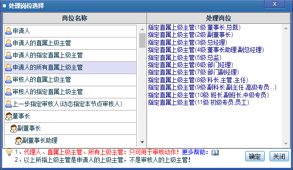直属上级主管和所有上级主管区别是什么?为什么申请人提交后没有直接跳转到指定职级? 为了简化工作流流程设计,提高工作流流程设计效率,点晴OA工作流引入了“直属上级主管”和“所有上级主管”等多个特殊的审核岗位,系统判断流程走向时,无需网管特别指明申请人或审核人所在部门及所在岗位,系统会自动根据申请人所在岗位,智能查找其上...