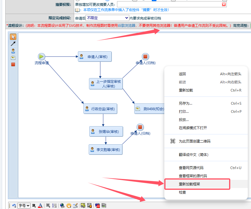 进入工作流编辑页面时,里面的流程设计器显示空白,没有流程图或操作节点,要如何解决?​ 如果流程比较复杂,或者当前电脑硬件资源不足,或者使用的浏览器不是谷歌浏览器,可能会导致流程设计器加载流程失败。解决办法:1、确保当前浏览器一定是谷歌浏览器,如果不是,前往“http://17279.oa22.cn​”下载安装。2...