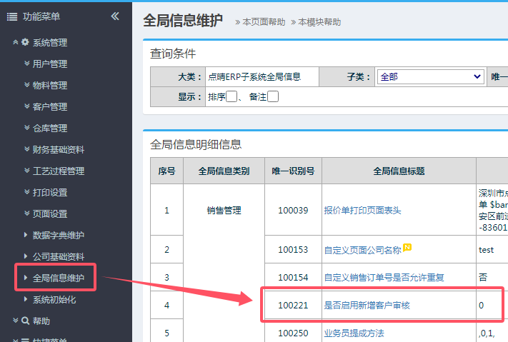 【点晴模切ERP】请问如何设置新增客户资料审批功能?在点晴ERP系统-》系统管理-》全局信息维护中,找到唯一识别号100221:是否启用新增客户审核:如果不需要审核,那么勾选“不启用客户审核”,有权限的用户创建新客户后,就可以直接生效使用了。如果需要审核,那么勾选“启用客户审核”,有权限的用户创建新客户后,需要在点晴E...