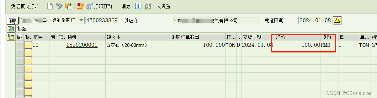 修改已收货采购订单的价格会带来什么影响** 以下为测试数据,原采购订单净价为100RMB第一次收10吨后,会计凭证如下图所示做发票预知,金额为1000RMB更改采购订单净价为200RMB再次查看收货会计凭证,发现收货后更改采购订单单价不影响已收货物料的会计凭证再次做发票预制,发现金额按照最新采购订单单价计算综上:可发...