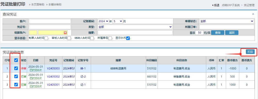 【点晴模切ERP】财务管理模块中如何批量打印凭证?进入总账系统,选择”凭证管理“--》点击”批量打印“。勾选需要打印的凭证,点击”打印“按钮,进入打印预览后,选择打印即可。