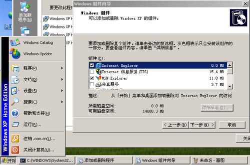 这时,打开你的控制面板,并点击"添加删除程序"图标,之后点击"添加删除Windows组件",你应该可以看见图一的界面。请仔细看,在开始菜单中显示的操作系统是Windows XP Home,但是经过修改,已经有了添加IIS的选项了。