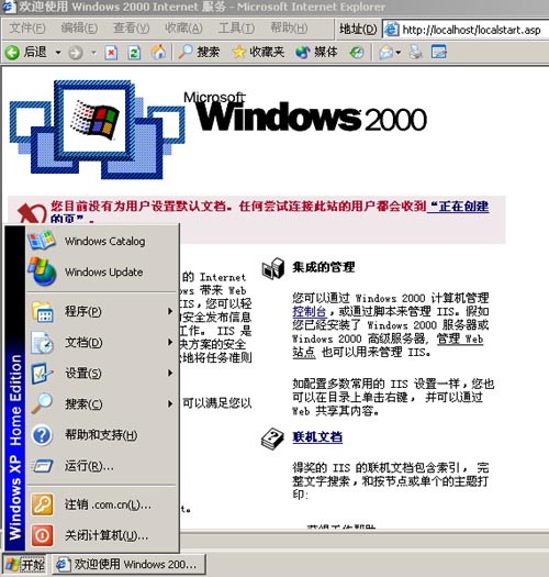 在安装结束后,你可以打开控制面板-性能和选项-管理工具,"Internet信息服务管理"已经出现在那里(图二)。如果你想要验证IIS是否运行正常,而已打开IE,在地址栏中输入"http://localhost"然后回车,如果能看到图三的界面,那么你的IIS就全部正常运行了。