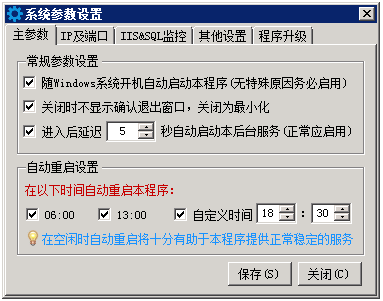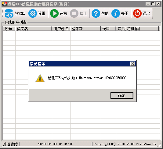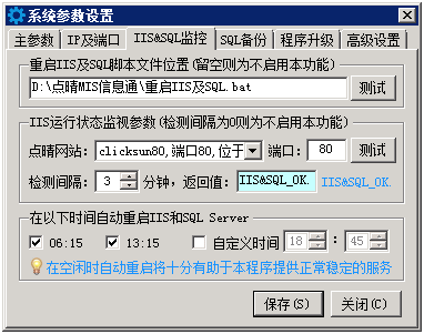 以上端口没有特殊原因的话,不应该频繁改动,否则会导致用户PC客户端连接异常,一般保持默认的58000即可; 文件和信息传输端口设置为2425即可,更改为其他端口后将导致本程序无法兼容飞鸽传书、飞秋等同类软件,但可以确保在同一台电脑上点晴MIS信息通PC客户端与此类软件共存并正常运行。 ![]() 以上设置用于确保服务于点晴OA的IIS和SQL Server正常运行。 开启方法: 1、点击“重启IIS及SQL脚本文件位置”的“测试”按钮,确保脚本执行正常,如果不正常可以自行修改该脚本文件,具体内容可以自行百度相关知识; 2、点击“IIS允许状态监视参数”-》“点晴网站”,选择点晴MIS系统所在的网站,如果启用了多端口,则需要自行修改“端口”为正确的端口,然后点击“测试”按钮,看看页面返回值是否是“IIS&SQL_OK.”,必须是这个才是正确的; 3、在“在以下时间自动重启IIS和SQL Server”中,根据本单位上班时间勾选合适的自动重启时间,一般不冲突的话,就应该全部勾选; 4、点击“保存”按钮后生效。 如果OA服务器的IIS和SQL Server是放在两台不同的服务器上,那么本项目应该关闭不用。 关闭方法: 清空“重启IIS及SQL脚本文件位置”、将将检测间隔设置为0、“在以下时间自动重启IIS和SQL Server”全部取消。 如果进入以上页面提示以下错误: