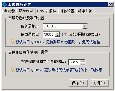 没有特殊原因的话,以上地址务必使用:0.0.0.0,表示不区分接收IP,这是解决有外网和内网用户同时连接到OA服务器时,能够确保所有用户电脑正常接收新信息推送提醒的唯一方法。 例如上面这台服务器有三个网卡和IP地址,如果设置为内外IP地址或外网IP地址,就都会导致只有连接到这个IP的用户电脑可以正常使用,另外一些用户无法使用。 先点击“停止”按钮,然后点击“设置”按钮,进入设置页面: ![]() 上面几项没有特殊原因的话,务必都全部勾选。