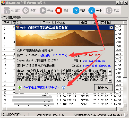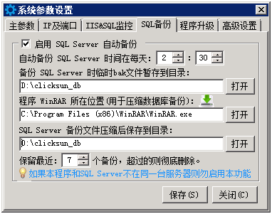 解决方法参见:点晴MIS信息通后台服务程序配置时提示错误:检测IIS网站失败Unknown error(0x80005000),如何解决? ![]() SQL备份功能可以自动备份点晴OA数据库到指定位置,保留最近备份数量取决于硬盘剩余空间,剩余大的话,可以保留多一些,例如60(最近2个月)。 ![]() 点击“关于”,就会看到是否有新版本,点击下载,就可以下载升级包,解压覆盖即完成升级。 相关参考教程: