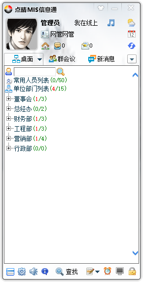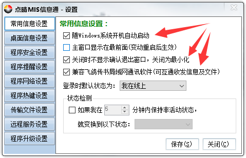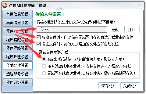为了方便日常办公,建议发送和接收文件都设置为自动处理;文件发送方式一般设置为智能切换即可,也可以根据实际需要设置为离线发送模式。 :开始使用恭喜,请尽情享用点晴MIS信息通。 其他说明: 点晴MIS信息通PC客户端需要使用端口2425发送文件和信息、使用端口5900进行远程桌面协助操作,请在防火墙中开放允许本程序通过这两个端口。 相关教程: