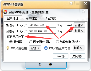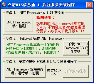 :确保使用环境安装前务必联系管理员,确保已经将本单位OA系统升级到最新版,并已经安装点晴MIS信息通后台服务程序。 :关闭杀毒软件为避免安全软件(360安全卫士、QQ电脑管家、火绒安全软件、Windows Defender等)对程序安装过程干扰,先务必彻底停止并退出本机安全软件运行。 :下载安装程序与本单位管理员确认无误后,点击下载点晴MIS信息通PC客户端,以下地址任选一个下载即可: :开始安装下载后,将安装包解压在D盘任意一个目录下,点击“点晴MIS信息通安装程序V*****.exe”: ![]() 双击后,如果用户电脑上未安装Microsoft .NET Framework 4.0以上环境,就会弹出以下界面提醒先下载安装该程序: ![]() 然后双击执行刚刚下载的Microsoft .NET Framework 4.0安装程序。 安装完毕后再点击上面的“.NET Framework安装完毕后,进行版本检测”按钮,然后会看到以下界面: ![]() 没有特殊原因就无需改动默认的安装路径,直接点击“立即安装”,安装完毕后,就会自动打开登录界面: ![]() 如果不是出现以上界面,而是出现以下界面: ![]() 那么一定是用户电脑上的杀毒软件拦截了点晴MIS信息通的安装,并且删除了被安装的程序文件,只能彻底关闭退出杀毒软件,重新安装点晴MIS信息通即可。 :设置登录参数点击“设置网络”,根据本人实际使用环境,录入点晴OA系统的网址和常用登录方式: ![]() 输入登录网址和默认登录位置后,记得点击后面的“前往>>”按钮,检查是否能正确访问点晴OA系统,确认无误后点击“保存”按钮,就会返回到主登录界面: ![]() :设置使用参数在上面的主登录界面中输入自己的登录用户名、密码,如果当前电脑是本人专用,那么可以勾选“记住密码”、“自动登录”,否则不要勾选,然后点击“登录”,就会自动进入点晴MIS信息通主操作界面了: ![]() 进入后,点击左下角设置图标或者主菜单中设置菜单,进行必要的设置: ![]() 上面箭头所指三项,没有特别原因应该勾选上 ![]() 上面“程序靠近窗口边缘隐藏”可根据自己的习惯确定是否勾选 ![]() 上面自动锁定无特殊原因应该勾选,下面全自动登录如果确定电脑是本人专用可以勾选,一般自动登录等待时间设置为3-5秒为宜