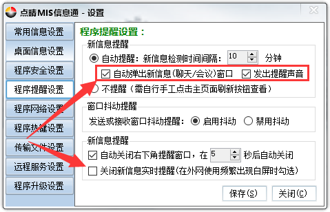 上面自动弹出新信息和发出提醒声音没有特殊原因的话,应该勾选;下面的关闭新信息实时提醒在外网访问频繁白屏时可勾选,否则无需勾选