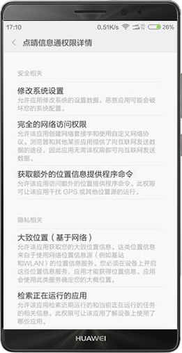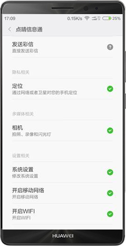 安装完点晴MIS信息通APP或微信版之后,如果是安卓是手机APP,那么需要去手机:设置—》应用管理,查看APP是否已经获得下面权限,如果没有取得下面权限,请赋予APP一下权限,修改系统设置、访问网络、访问位置等权限。