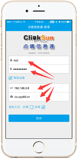 如果是点晴MIS信息通手机APP,进入手机APP登录页面,页面上的用户名及密码为WEB版登陆的用户名及密码,服务器地址及内外网登陆请按照下图填写,如果服务器在阿里云,勾选内网登陆即可。